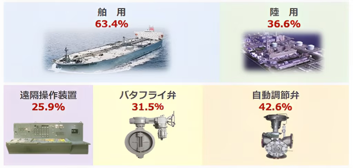 *2008年 主要造船国における大型舶用バルブのシェア。一般社団法人日本バルブ工業会及び一般社団法人日本舶用工業会の資料より中北製作所様調べ