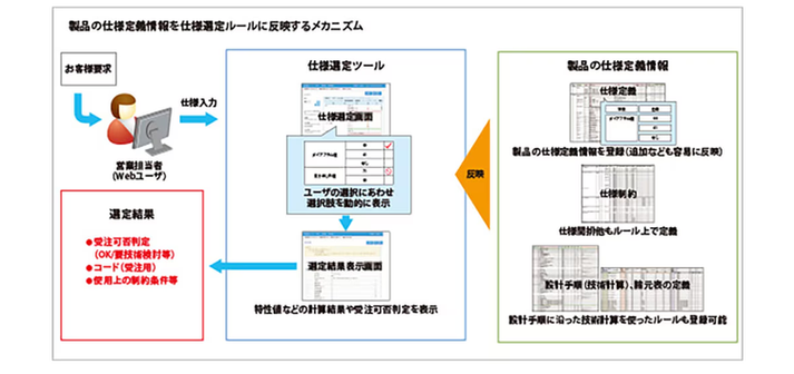 また、運用のし易さにも配慮しました。そのために、今回再整理した製品の仕様定義情報をそのまま仕様選定のルールに連携できるようなメカニズムを用意しました。製品開発、設計をしている担当者自らが、容易に仕様選定のルールを追加・更新できるという点も重要です。製品や仕様選定のルールがメンテナンスされなければ、無駄なツールになってしまいます。
